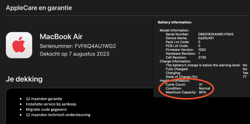 Ik ben 7 augustus 2023 voor het eerst geactiveerd en heb een batterij van 95% capaciteit met 31 laadcycli. Dit betekent dat ik in topconditie ben en nog vele jaren mee kan gaan. Ik heb 8GB RAM en 256GB opslagruimte. Dit is voldoende voor de meeste gebruikers.