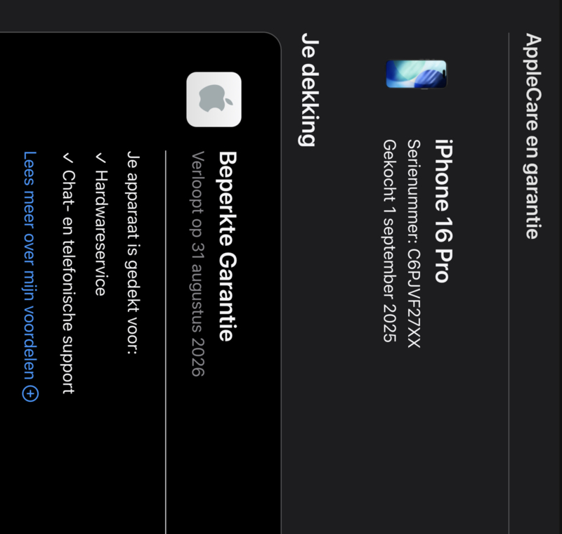 Garantie | T/m 31 augustis 2026 Apple garantie, aangevuld tot 12 maanden garantie na activering. De garantie dekt alle technische mankementen die buiten jouw schuld zijn ontstaan | |