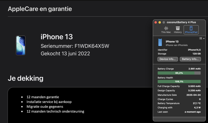 Ik ben voor het eerst 25 augustus 2022 geactiveerd en heb inmiddels ook een nieuwe batterij met dus ook 100% capaciteit. Ik ben dus nog in topconditie!